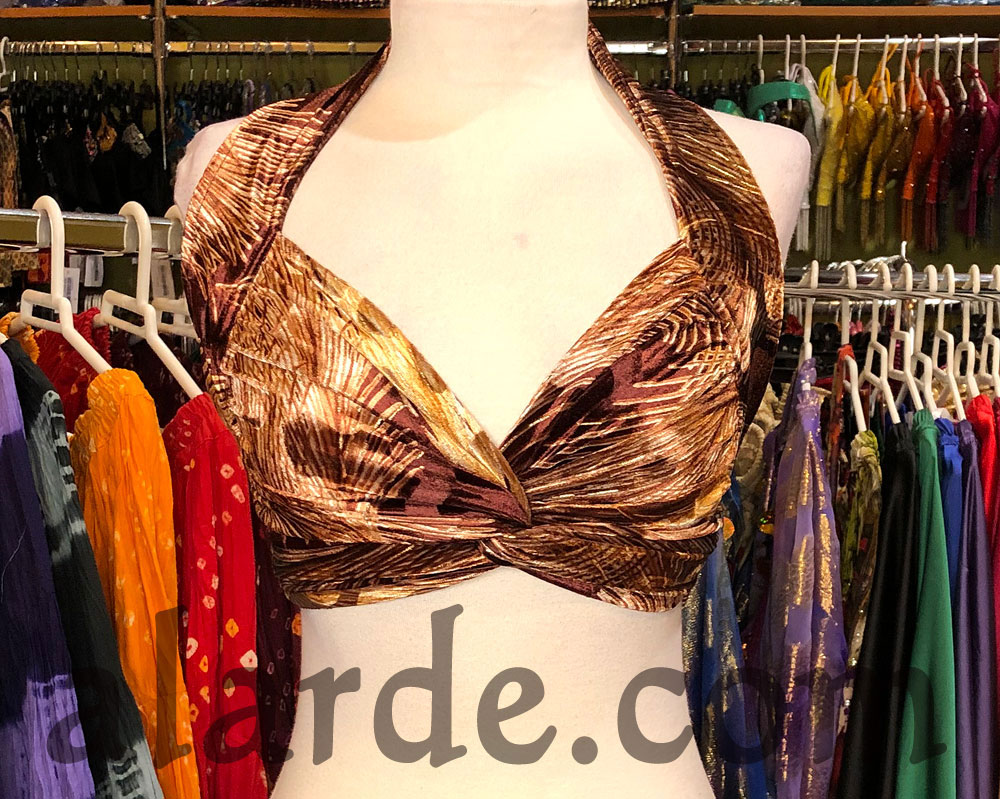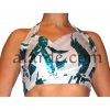 Sleeveless lycra top, crossovers and ties at the back. Fits a wide range of sizes