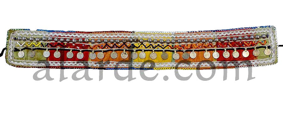 Base de cinturón afgano decorado con monedas antiguas y pequeños apliques de metal estilo tribal y fusión.