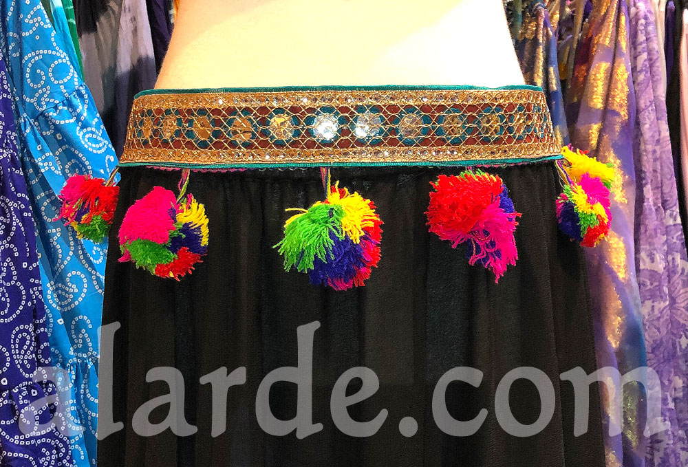 Cinturón ligero tribal, con imitacion de espejitos y con pequeños pompones de colores