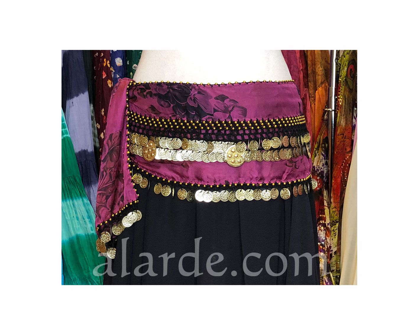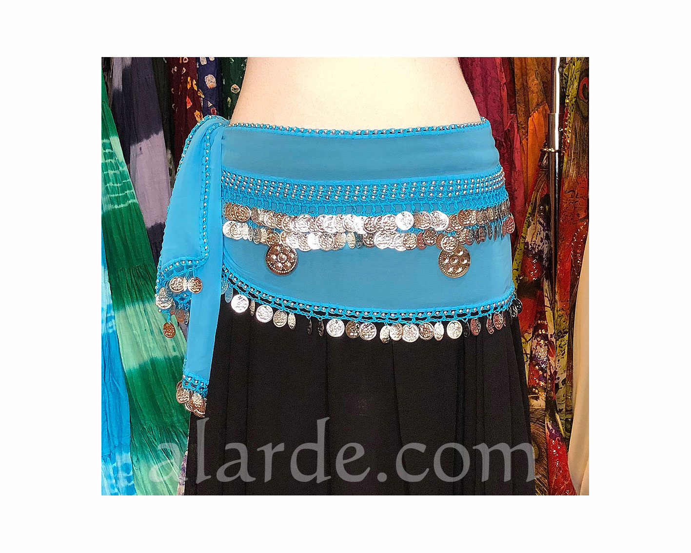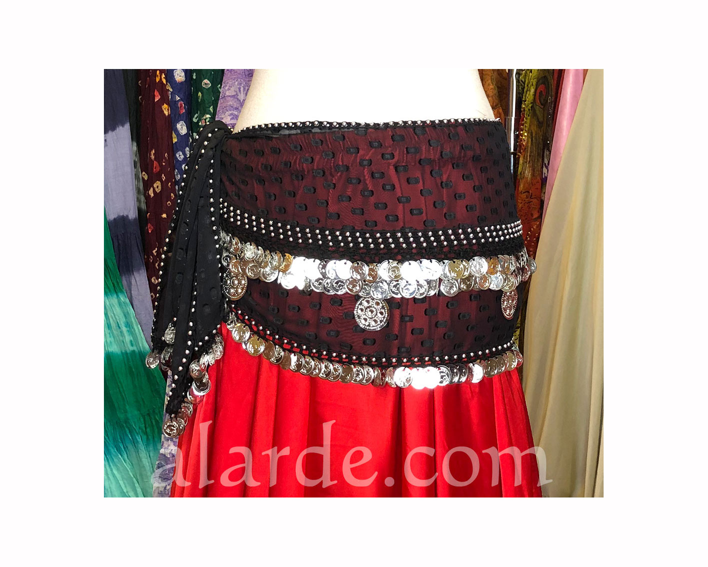 Pañuelo egipcio para la cadera con monedas que darán un toque de color, brillo y agradable sonido en tus clases de danza del vientre y tribal. Tejido a mano.