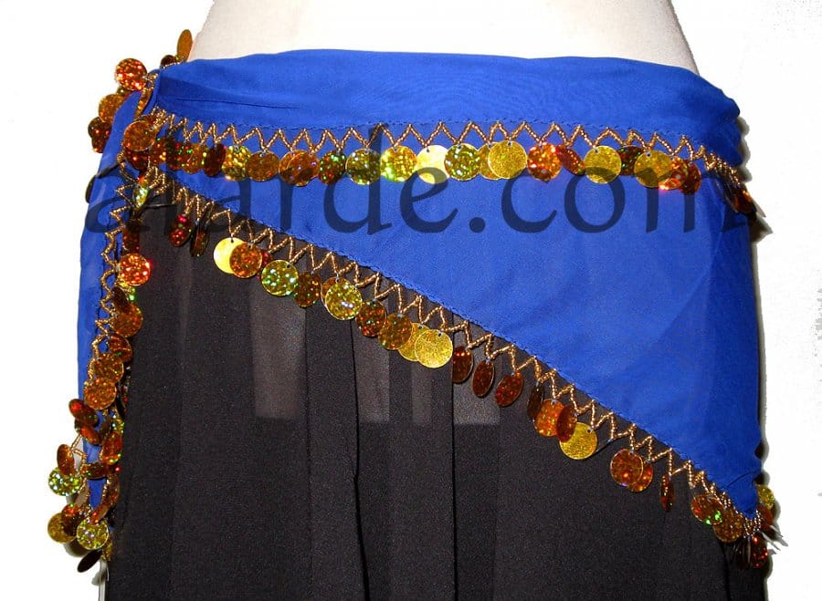 Pañuelo triangular para la cadera con una fila de pailettes y pedrería en el borde. Este modelo no pesa nada, es perfecto si no quieres que pese tu bolsa de ensayo, como no lleva monedas no suena y lo puedes usar para bailar con velo porque no engancha la tela.