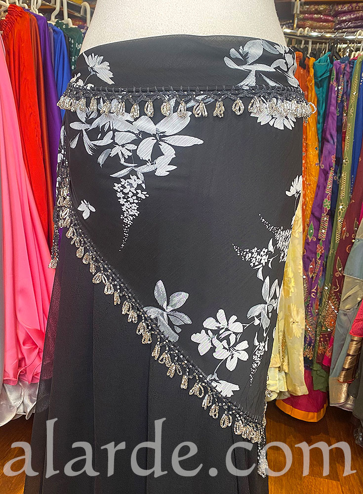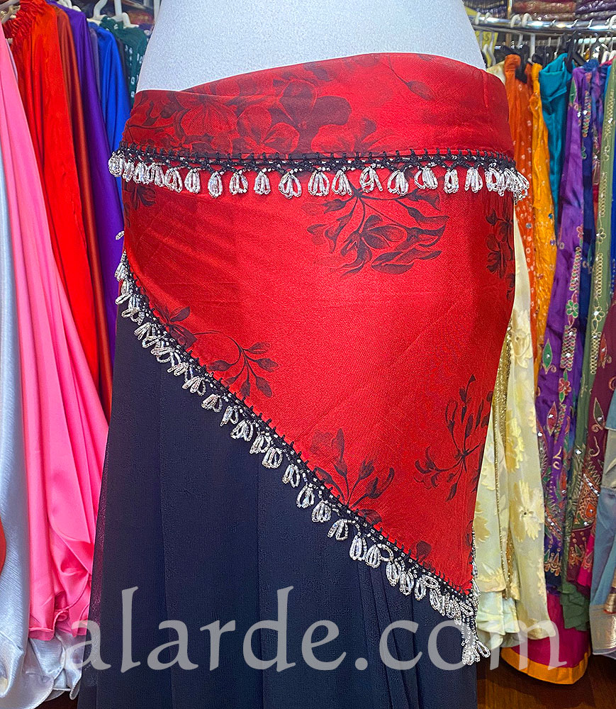 Pañuelo triangular de gasa cristal, el borde va rodeado con una fila de crochet con pedrería de cristal entretejida. Este pañuelo es muy versátil. Lo puedes usar tanto para ensayar como pañuelo de cadera, o como complemento de otro traje, como pañuelo para la cabeza o incluso como chal para dar un toque especial y elegante a tu ropa de calle.