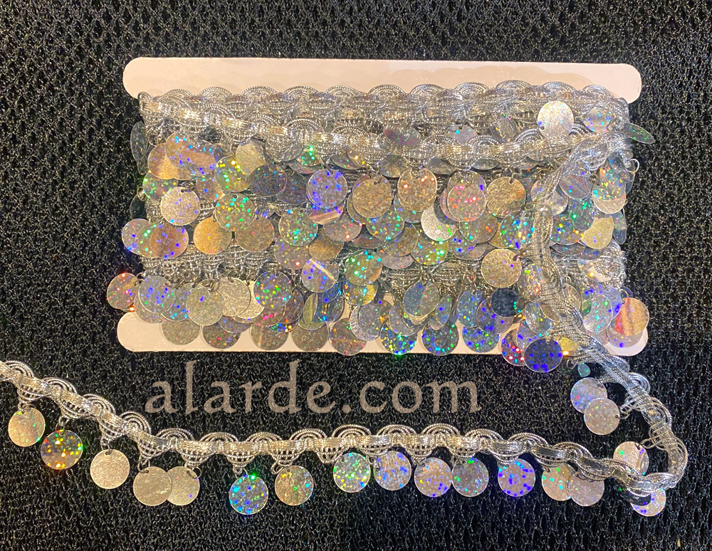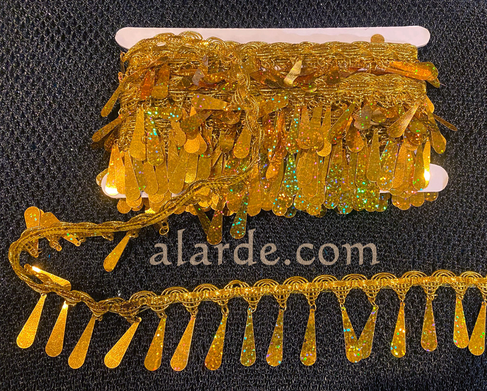 Paquete de pasamanería dorada o plateada con pailletes o lágrimas colgando con el que puedes adornar tops, pañuelos, cinturones, faldas y todo lo que se te ocurra.